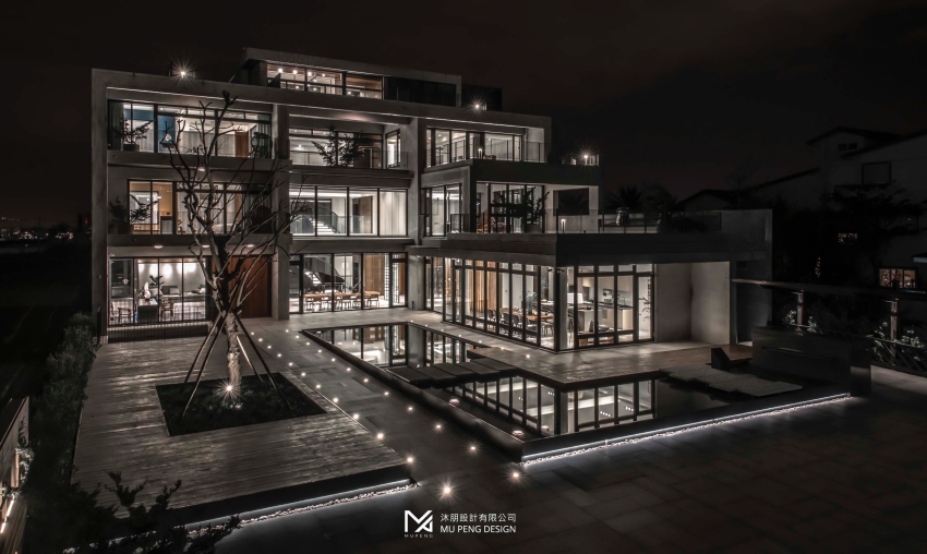 舉步移轉進入園邸,視線隨著透視、隱私兼具的紫檀木格柵落定,寬綽無虞的綠景水池腹地,予以獨棟宅邸最亮眼的展演舞台,建築立面以單邊進出面設計,展露逐層推進的立體層次,並以清水模與玻璃帷幕縱橫構成主體,邀請日光能夠無盡延伸入家,讓十足通透性柔化內外僵化視角。
